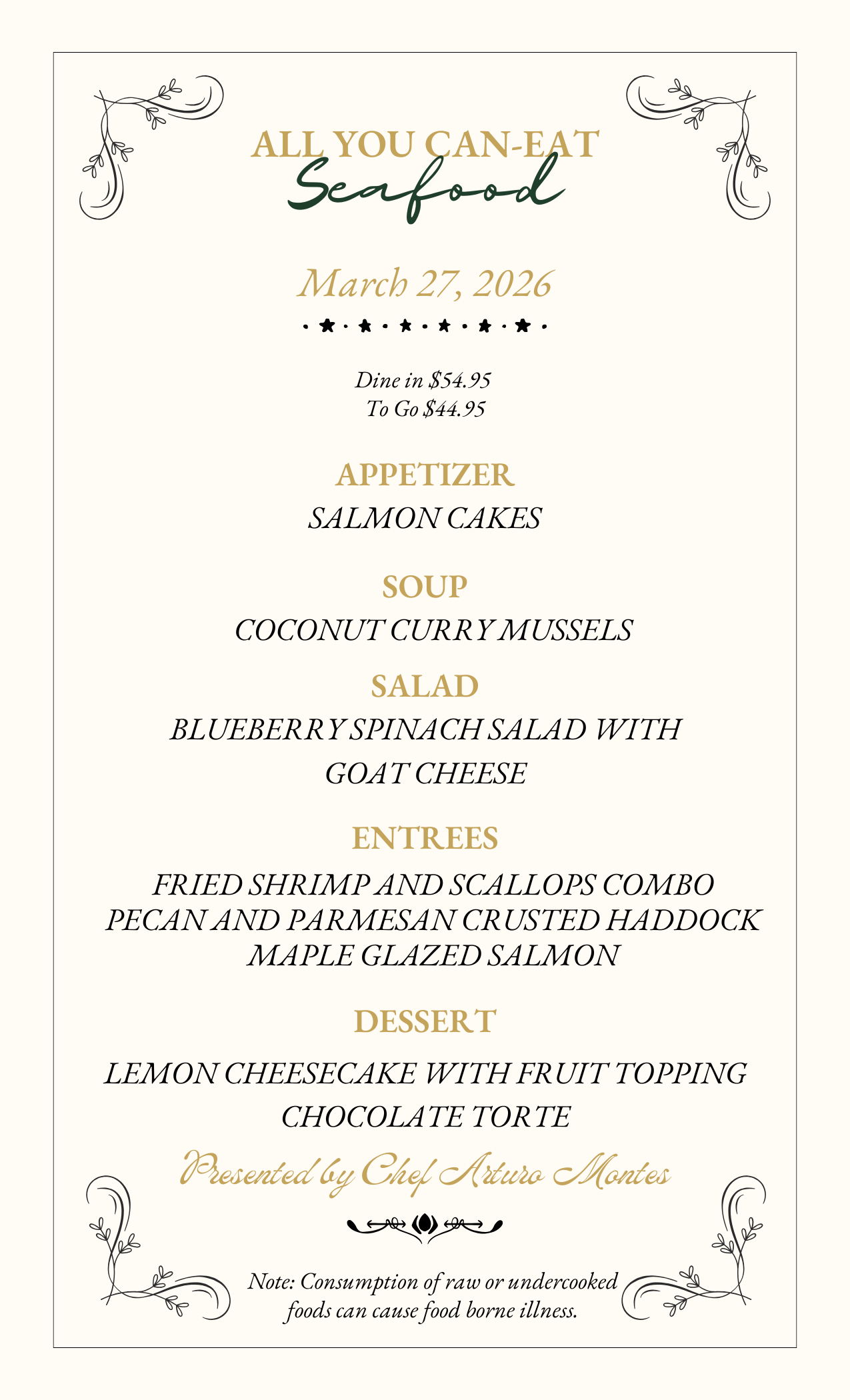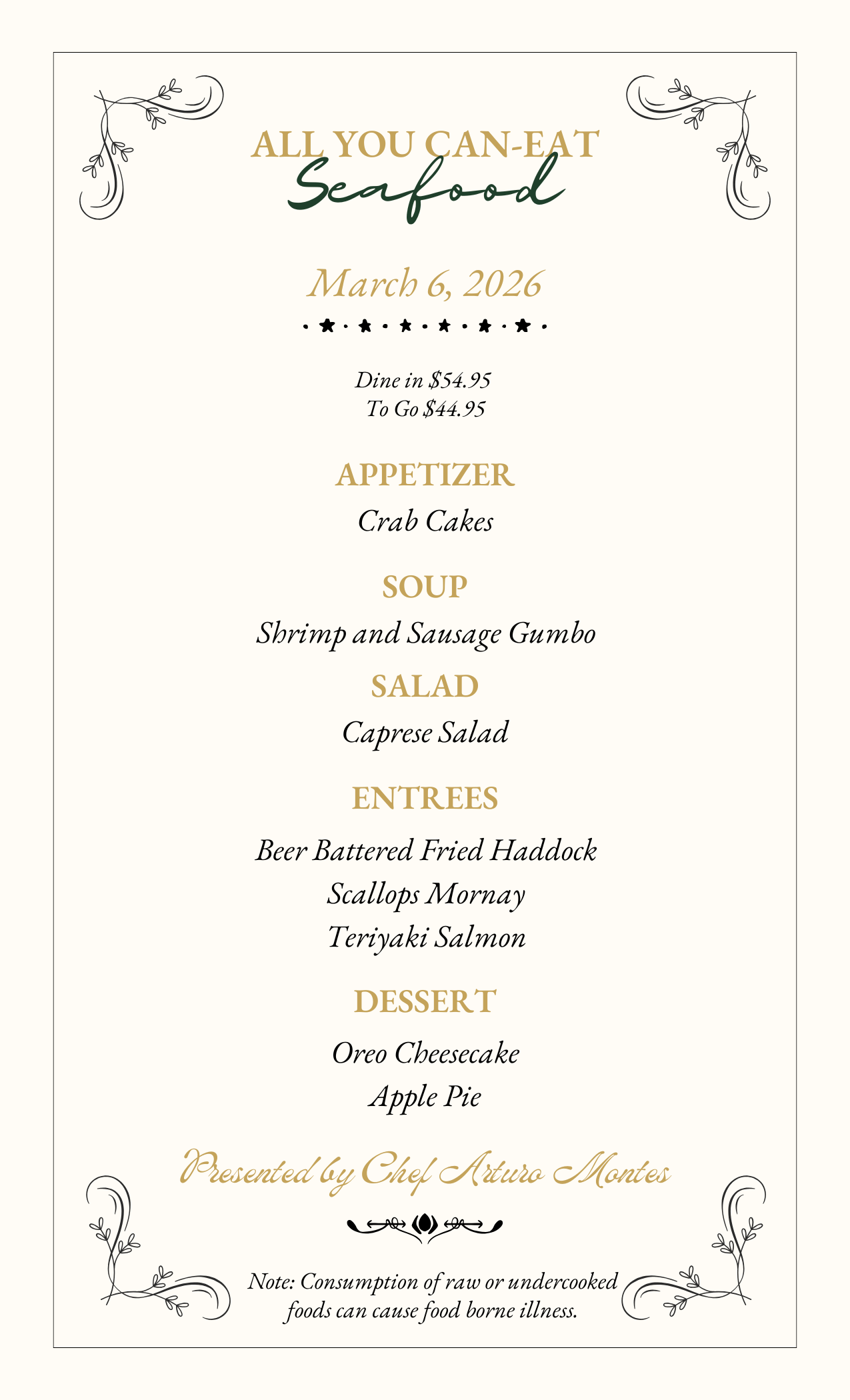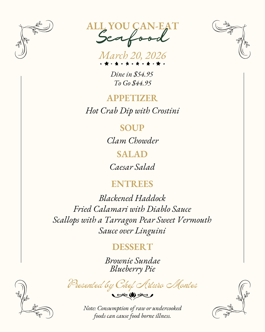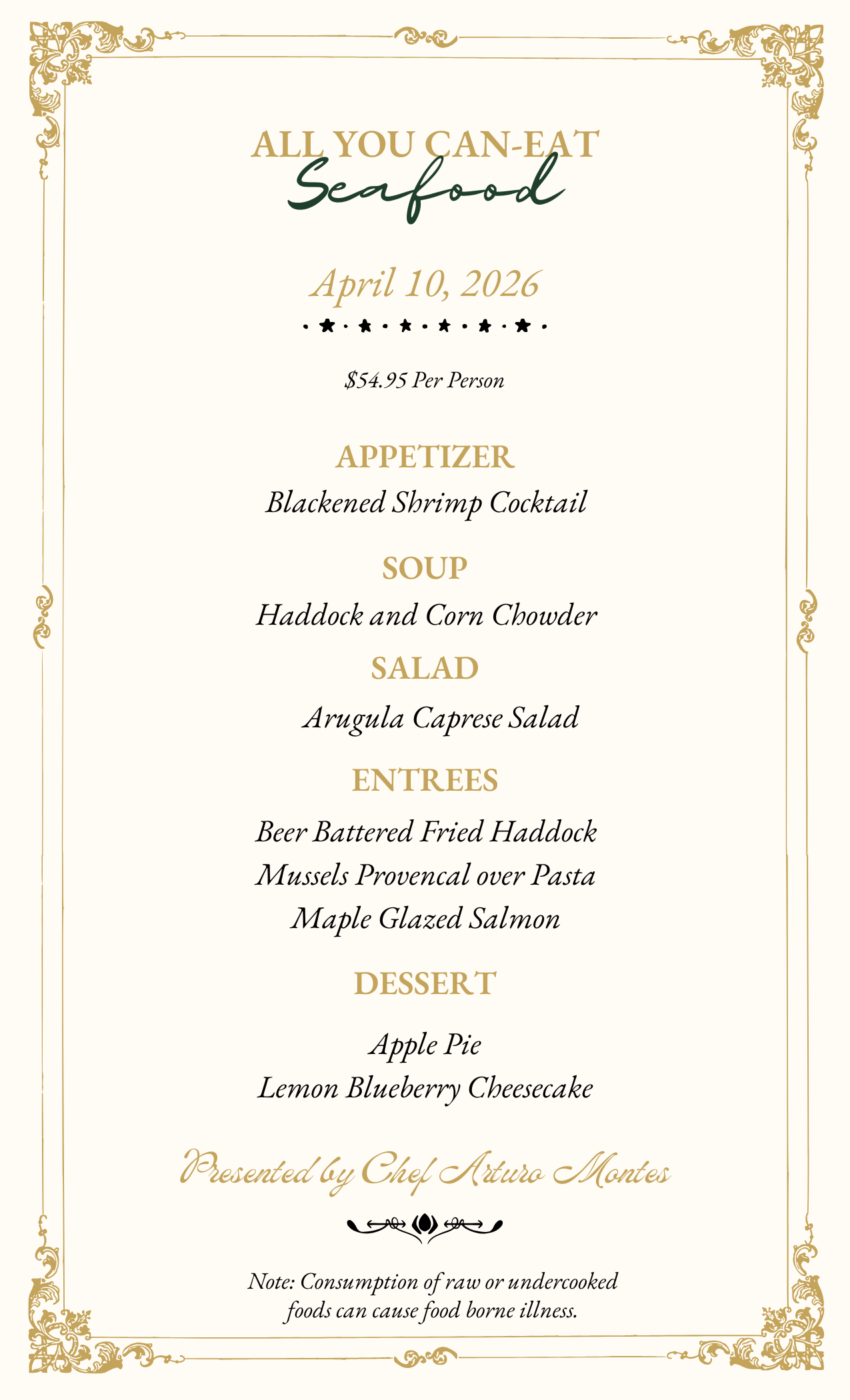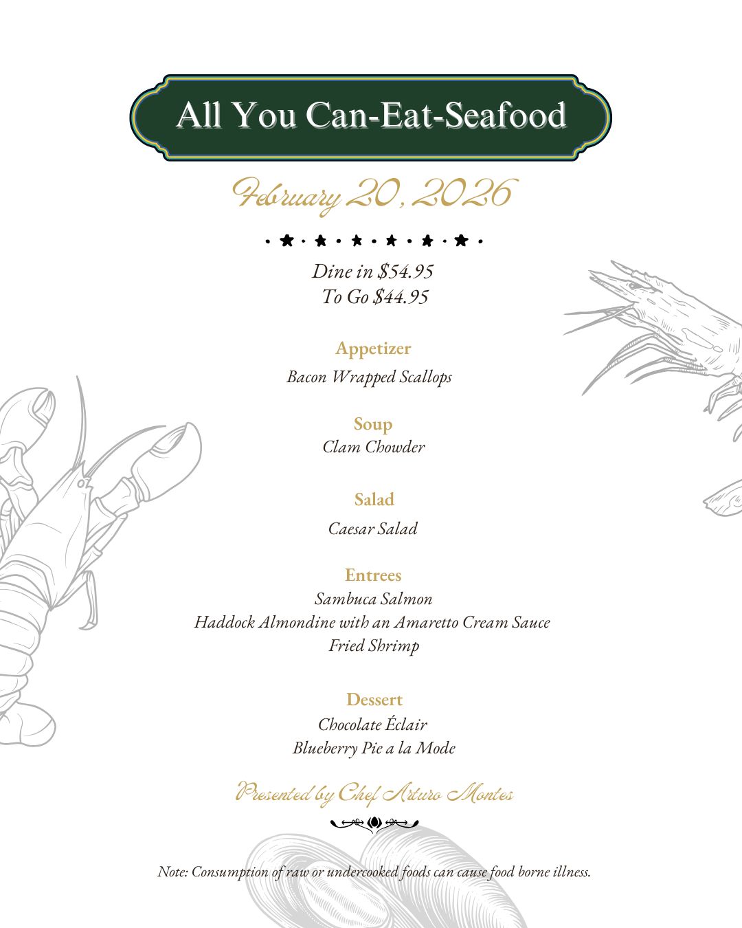 Get ready for a feast! Join us every Friday for All You Can Eat Seafood, with a new menu each week.